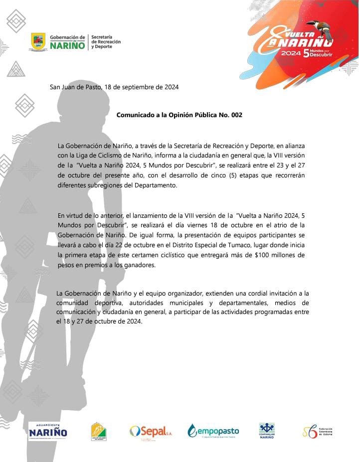 Luego de reuniones y opiniones y análisis de orden público por parte del gobierno regional y la secretaria de deportes del departamento de Nariño se resolvió realizar la octava versión de la Clásica a Nariño del 23 al 27 de octubre iniciando en Tumaco y finalizando en Pasto.