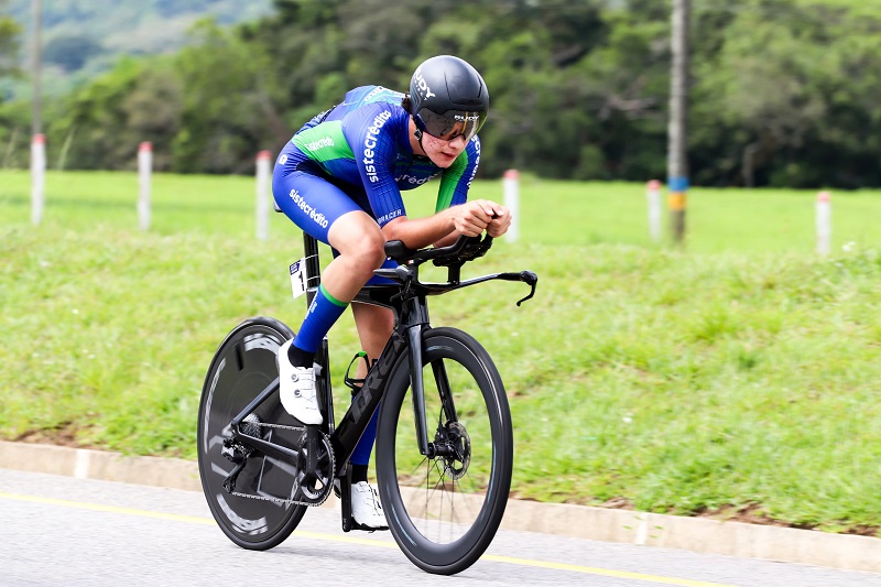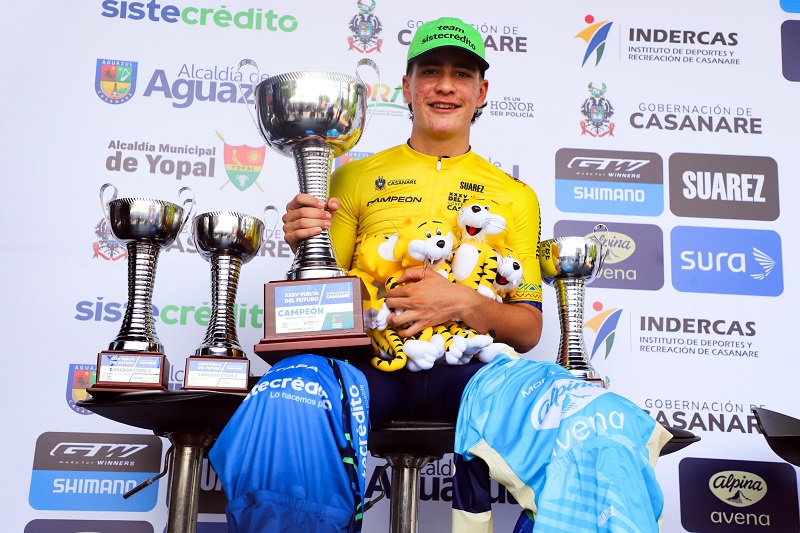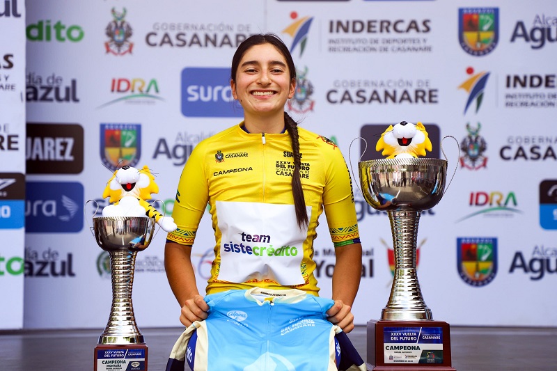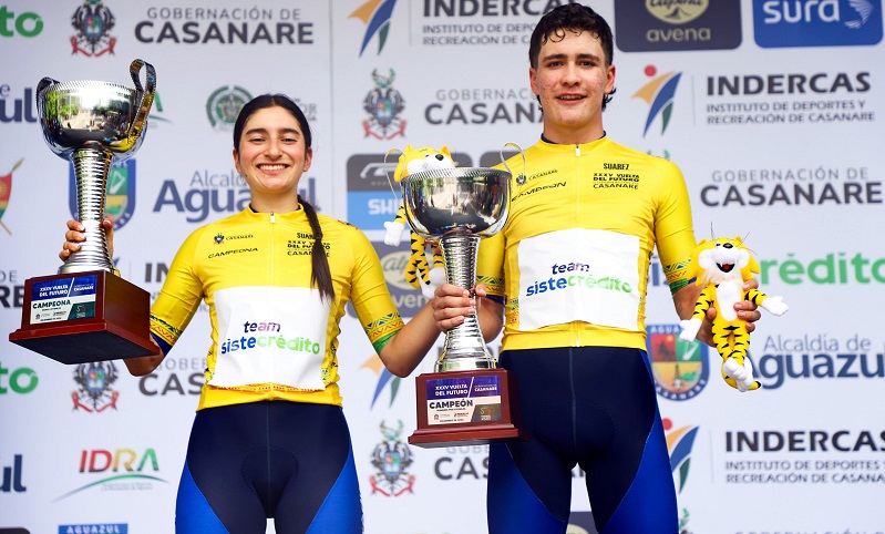 Moñona de Antioquia Sistecrédito al ganar las ramas de la vuelta nacional del Futuro, con Samara Bedoya y José Manuel Posada, al cerrarse la carrera con una CRI en Aguazul llanos de 15.3 kilómetros